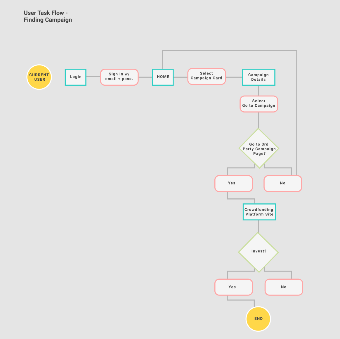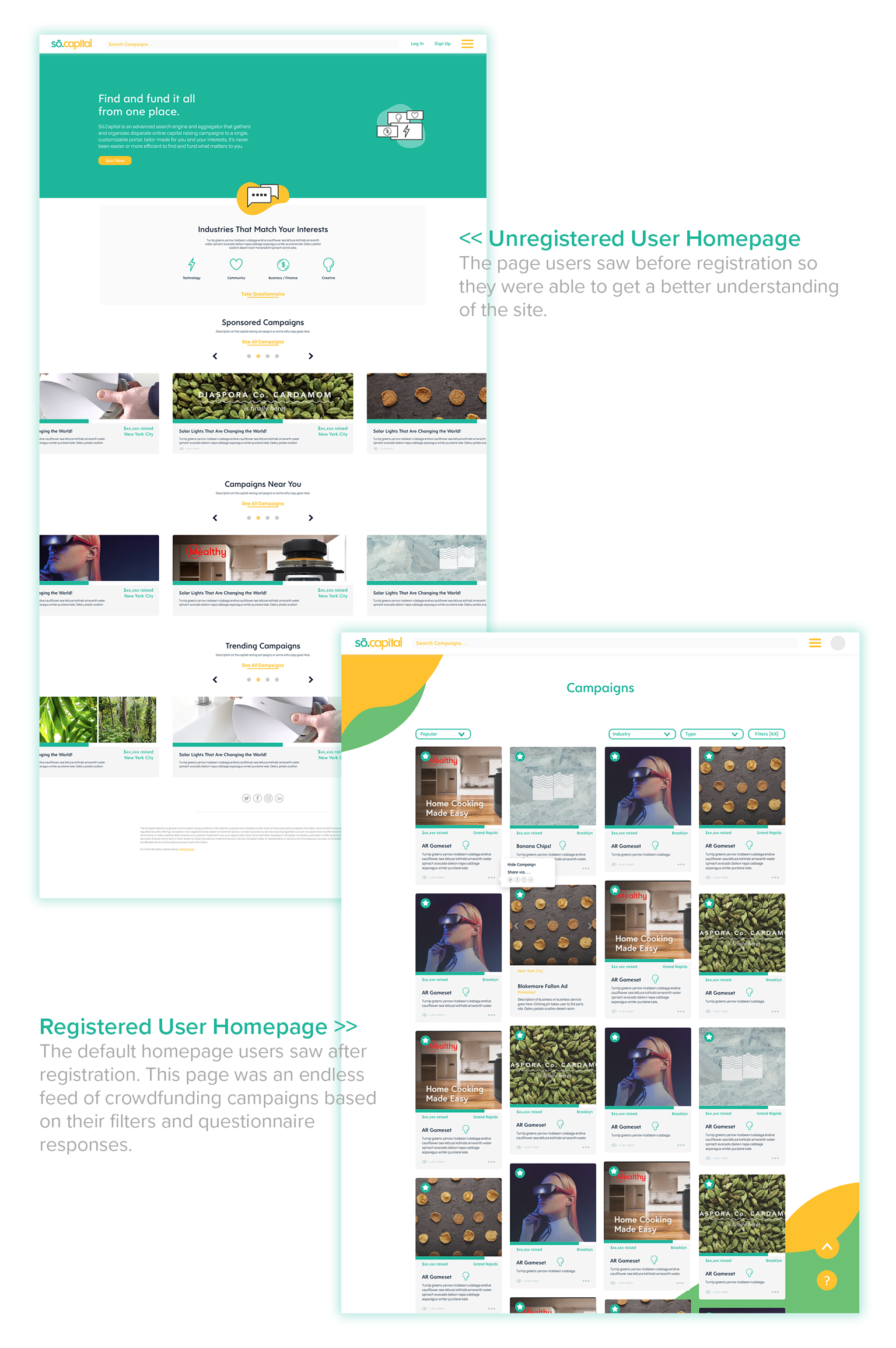 Designed to be easy to navigate and filter. The registered user’s homepage was built in a similar fashion to Pinterest with detailed cards so users could decide which campaigns to view. One main goal of the website was to gain registered users. Unregistered users were only able to view a few campaigns on the site until prompted to register on the site.
