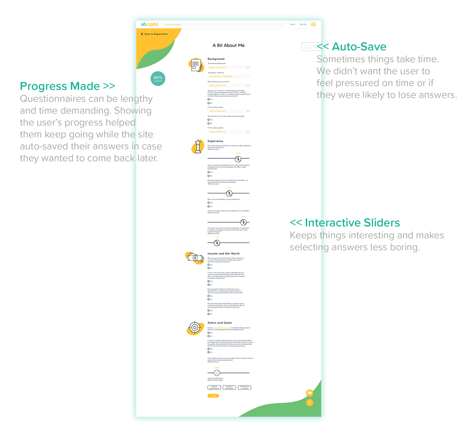 Bright, colorful and friendly. We wanted the look and feel to be attractive to various users - from top investors to those who just want to find campaigns to donate.
