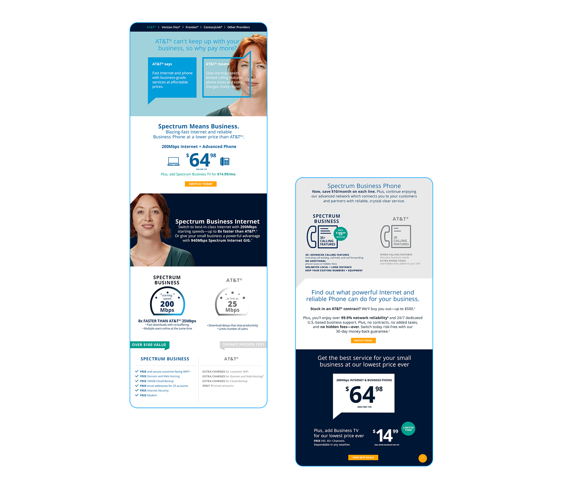 Our viewers reached the campaign microsite through OLA, social and emails. And this microsite was full of every argument point on why they should switch or choose Spectrum Business. We designed charts and infographics that changed based on competitors offers and services. Body copy changed per market audience.