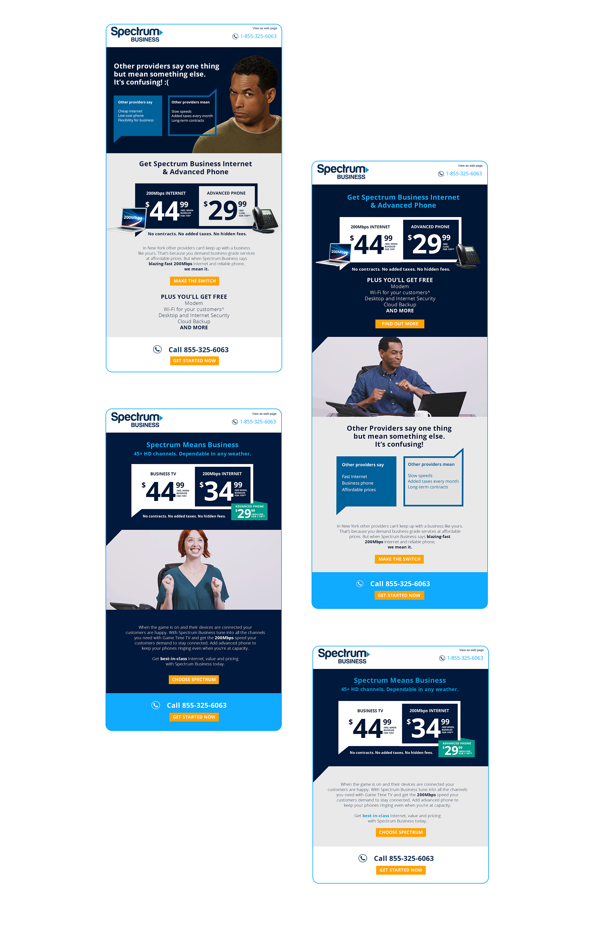 Emails came in batches of 4 for new and old business owners around the US. The batch focused on benefits of Spectrum versus all other competitors instead of specific ones listed on the site. Emails took viewers to the microsite to make the switch from their competitor to Spectrum Business.