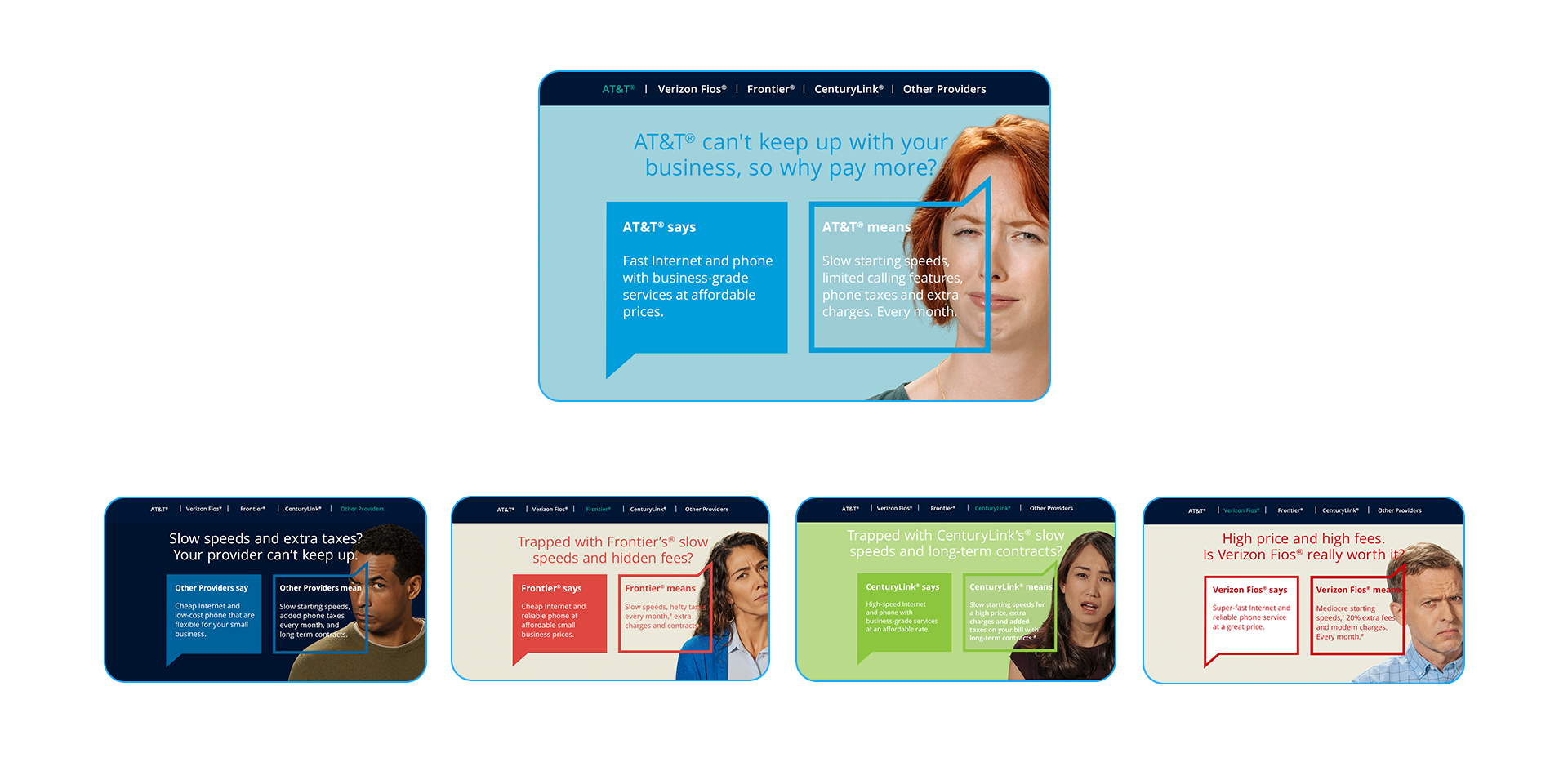 Competitors say one thing, but what do they really mean? Calling providers out directly, we used brand colors, known marketing offers and top criticisms to create transparency around what Spectrum Business offered.