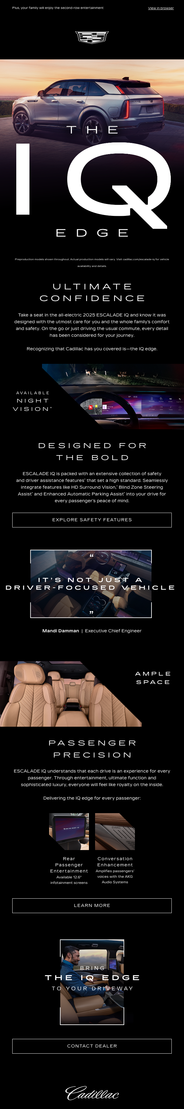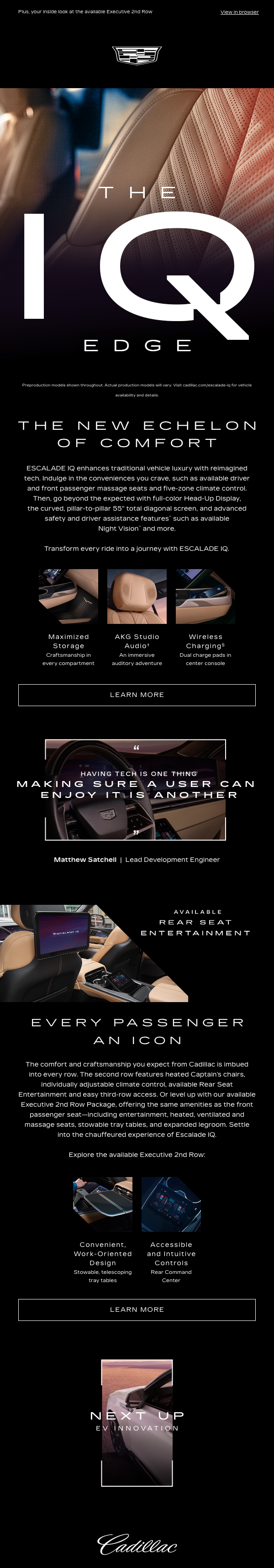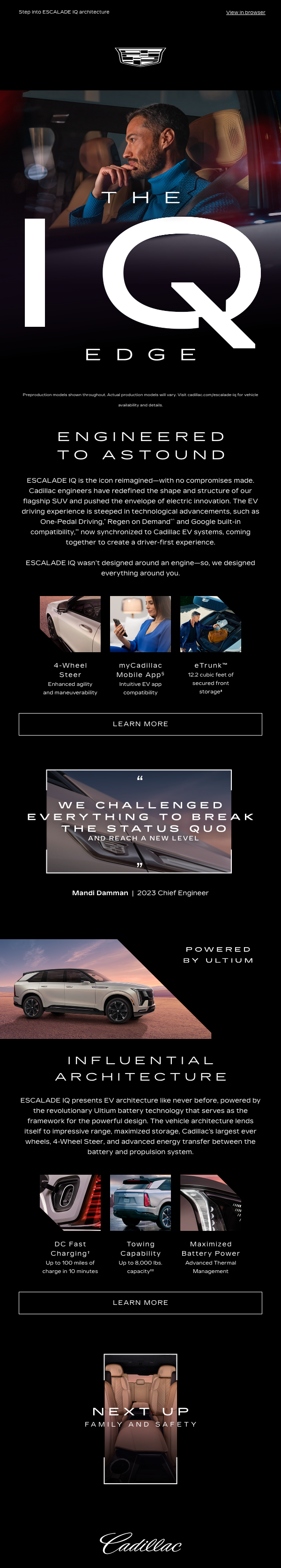 Escalade is going electric. And it's big. Real big. When engineers created the ESCALADE IQ, they made no compromises. A six touch email program for handraisers, The IQ Edge rewarded viewers with insider information from Cadillac's engineers and designers.